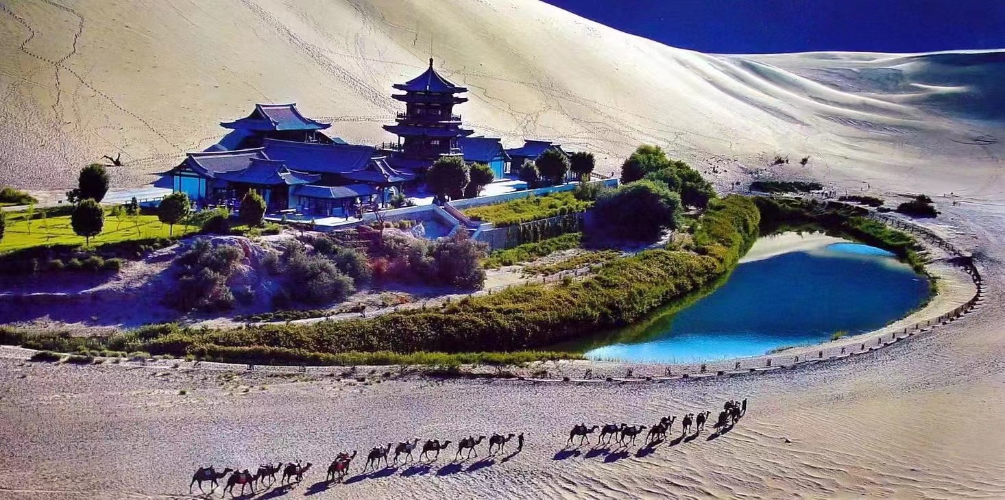 D1、8:00敦煌集合,乘車參觀國家5A級風景名勝——大自然奇觀【鳴沙山月牙泉】(游覽時間約2小時),古往今來以“山泉共處,沙水共生”的奇妙景觀著稱于世,被譽為“塞外風光之一絕”1994年被定為國家重點風景名勝區,鳴沙山由流沙積聚而成,沙體遇到摩擦震動,便會殷殷發聲,輕若絲竹,重如雷鳴,故名“鳴沙山”,月牙泉位于鳴沙山北麓,因外形酷似一彎新月,故名“月牙泉”。千百年來不被流沙淹沒,不因干旱而枯竭。游覽結束后乘車返回敦煌市入住酒店。 午餐后,乘車前往參觀被譽為“東方藝術寶庫”的【莫高窟】(游覽時間約2.5小時)。莫高窟俗稱千佛洞,被譽為20世紀最有價值的文化發現,坐落在河西走廊西端的敦煌,以精美的壁畫和塑像聞名于世。1961年,莫高窟被公布成為第一批全國重點文物保護單位之一。1987年,莫高窟被列為世界文化遺產。西千佛洞位于莫高窟西35公里處,開鑿時間早于莫高窟,是敦煌藝術的重要組成部分。參觀結束后入住酒店休息。
